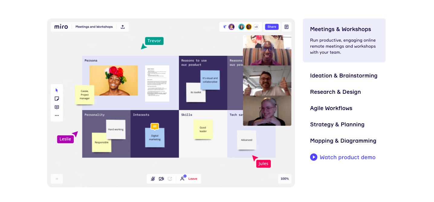 现在,Miro正成长为一个更加全面的线上可视化协作平台,支持不同领域和类别的团队进行头脑风暴会议、设计项目和管理工作流程。Miro为用户提供近1000个模板,用户可以创建笔记、设计和流程图等,还可以通过Miro进行视频通话和在线聊天。该平台还与包括Atlassian、Cisco、Google Workspace、Microsoft Teams和Zoom等100多个应用程序进行集成和连接,使用户可以在运用其他软件时同时使用Miro的功能。