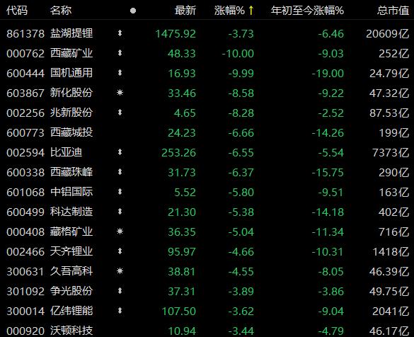 另外,西藏城投、藏格矿业、西藏珠峰、科达制造跌幅均超5%;川能动力下跌2.63%、盛新锂能下跌1.17%。