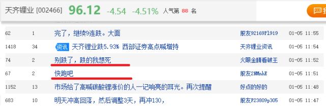 “血亏的一天,清仓了,兜不住了!”“别跌了,跌的我想死”“快跑吧!”1月5日,多位投资者在天齐锂业的股吧里感慨;也有股民称,“一片鬼哭狼嚎,快到底了。”