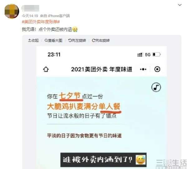除了年度听歌报告外,今年一位网友的外卖年度账单中“老板,今天是我生日可以送我一个小菜吗”的备注,也被评价为“是你始终如一的坚持”,并显示共备注了77次。还有网友晒出自己的外卖年度账单,并表示“点个外卖还被内涵”,因为其中显示“在七夕节点过一份大脆鸡扒麦满分单人餐”。