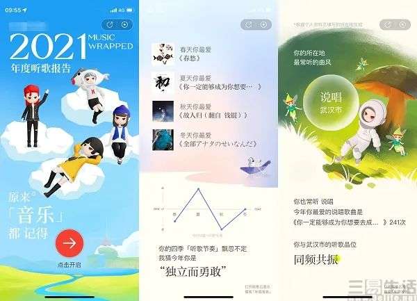 在查看各APP的年终报告后不难发现,其共同点都是以配有BGM的简洁插画或动画形式为主,并对统计数据佐以文案和场景,再以各自的主题侧重(比如时序等)进行逐一展现。最后以用户画像或群体类型进行总结,例如排名数据、同类偏好或同一地区的偏好,以及兴趣爱好圈层等。