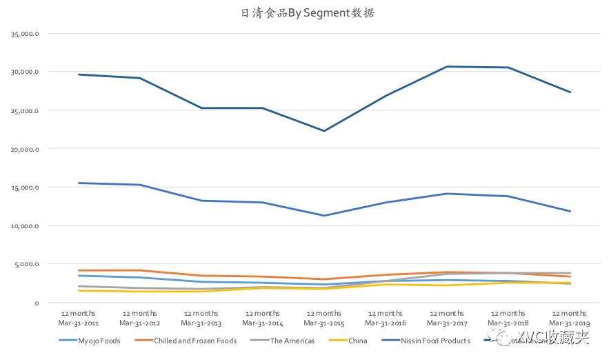 上图是日清从2011年到2019年,按照业务划分的财务数据。我们可以看到,在这十年的时间内,日清销售额的总量略微下降,从300亿降到了275亿。有重要两个因素影响了总量的走势:首先是日清在中国市场和美国市场的业绩在上升,这对总量带来了正面影响;另外一个是日清在日本的核心品类——Nissin Food,包括它的方便面,方便菜汤——业绩下滑非常明显,从150多亿下降到了110多亿。另外Myojo Food(日清旗下速食品牌)的业绩略微下跌,Chilled and Frozen Foods(冷冻食品)的业绩明显下跌。