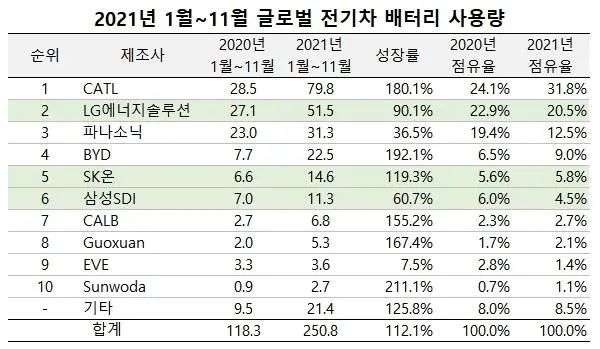 韩国市场研究机构SNE Research发布的最新数据显示,2021年1-11月,宁德时代仍然把持着市场头把交椅,市占率达到31.8%,超过第二名的LG化学10个百分点以上,后者份额为20.5%。