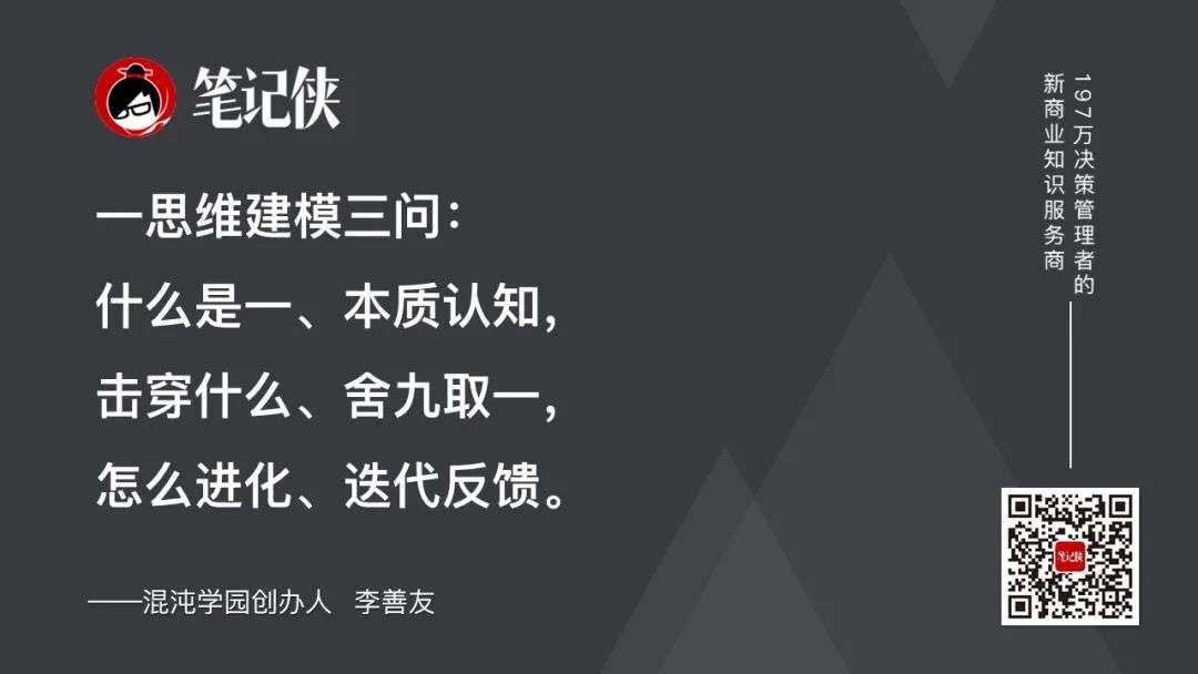 一思维建模,就是这三问:什么是一、本质认知,击穿什么、舍九取一,怎么进化、迭代反馈。