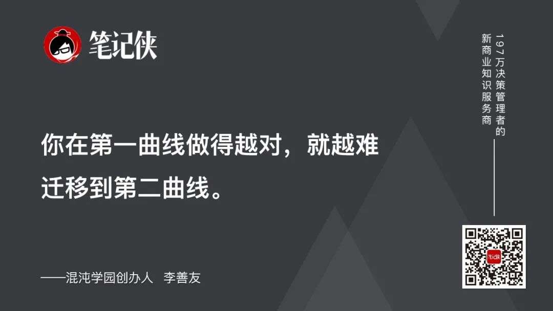 第一曲线到第二曲线间存在着一个非连续性鸿沟,第一曲线里的最佳实践就是到不了第二曲线。你在第一曲线做得越对,就越难迁移到第二曲线。