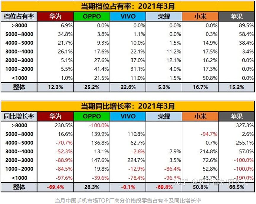 数据方面的反馈更加直观。知乎科技答主“安乎都护府长史”2021年3月的统计数据显示,苹果在5000-8000档位的占有率达到58.4%,比华为高了23.6个百分点。在8000以上档位,苹果的占有率接近90%,同比大增327.3%。