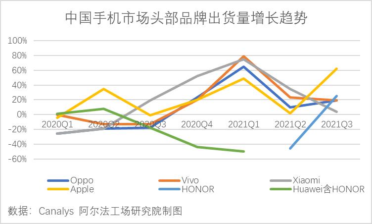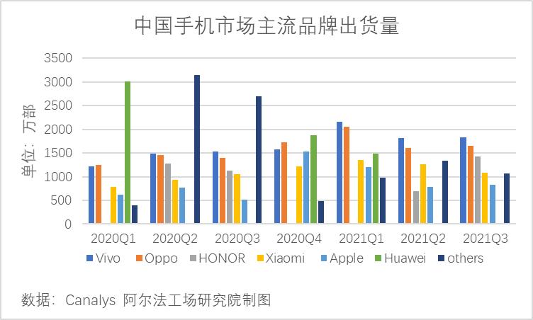 在此期间,OPPO除在2020年四季度以20%的市场份额超过VIVO成为市场第一外,其余均位列第二。与VIVO在2021年将市场份额稳定在23%的水平上不同的是,OPPO在2021年一季度拿下22%的高点后,二三季度停留在21%。