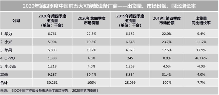 另一个潜力较大的领域是可穿戴设备。IDC数据显示,2020年第四季度OPPO的可穿戴设备出货量增长到了138万台,与第一名华为的市场份额存在17.7个百分点的差距。