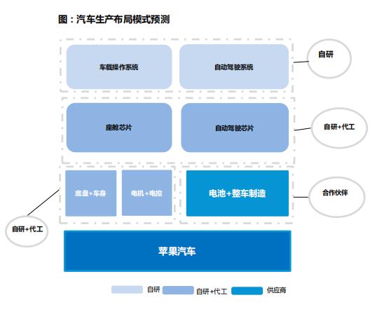 根据东吴证券的研报,苹果汽车或将采取与手机类似的生产模式造车,车载操作系统与自动驾驶系统完全自研,芯片、底盘、电机等将通过自研加代工的方式解决,电池与整车制造则通过寻求合作伙伴解决。