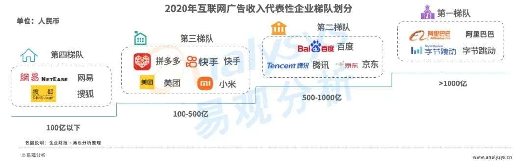 2020年,阿里巴巴稳居互联网广告收入TOP1地位,推荐信息流收入的增长、搜索变现单次点击均价的上升等原因推动其广告收入(即客户管理收入)继续增长。字节跳动位列第二,与阿里巴巴同属第一梯队。基于短视频的快速渗透,字节系流量优势放大,数据和算法优势及对搜索广告的拓展将为其营销收入带来更多提升空间。