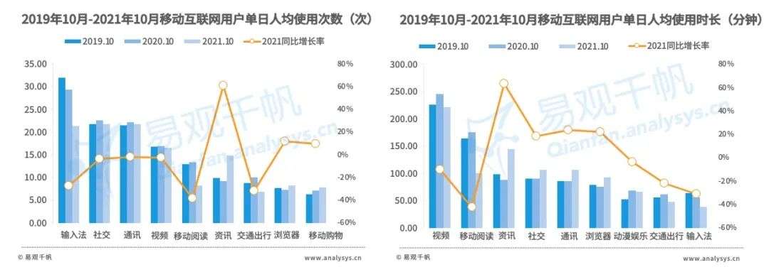 2020年,移动互联网不同领域间用户粘性呈现较大的差异,输入法等强工具属性类领域在人均单日使用次数方面占优;单日使用时长方面则是视频、资讯、阅读等强内容属性领域领先;社交领域则在两项指标上均位前四。