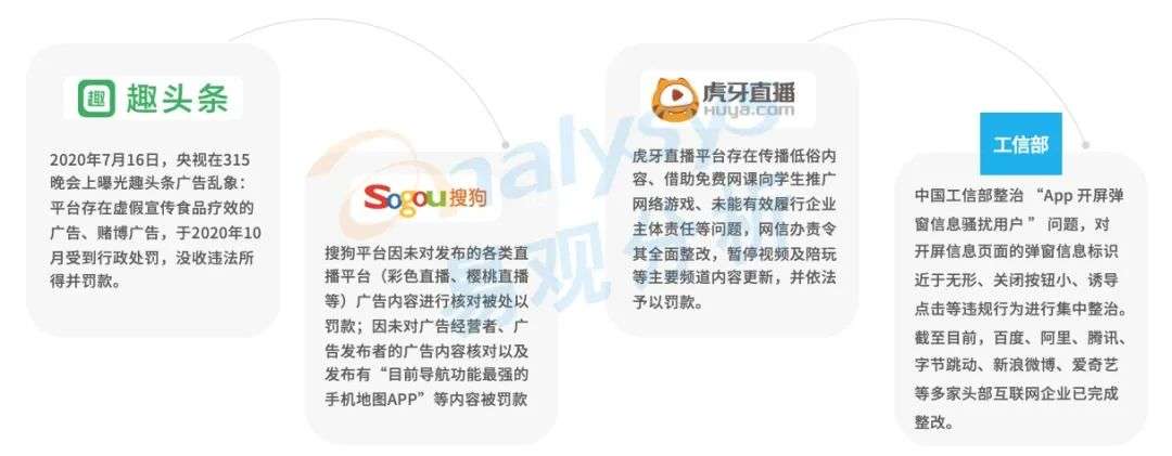 2020年,多部门单位联合展开各类专项工作,对于阿里、腾讯、字节跳动、百度等大型互联网平台企业,以及繁多的中小规模的新兴平台所出现的各类违法违规广告行为采取要求整改、予以罚款等措施。从具体行动来看,国家对互联网广告行业的规范力度继续加大,相关部门依法监管市场的水平进一步提高。