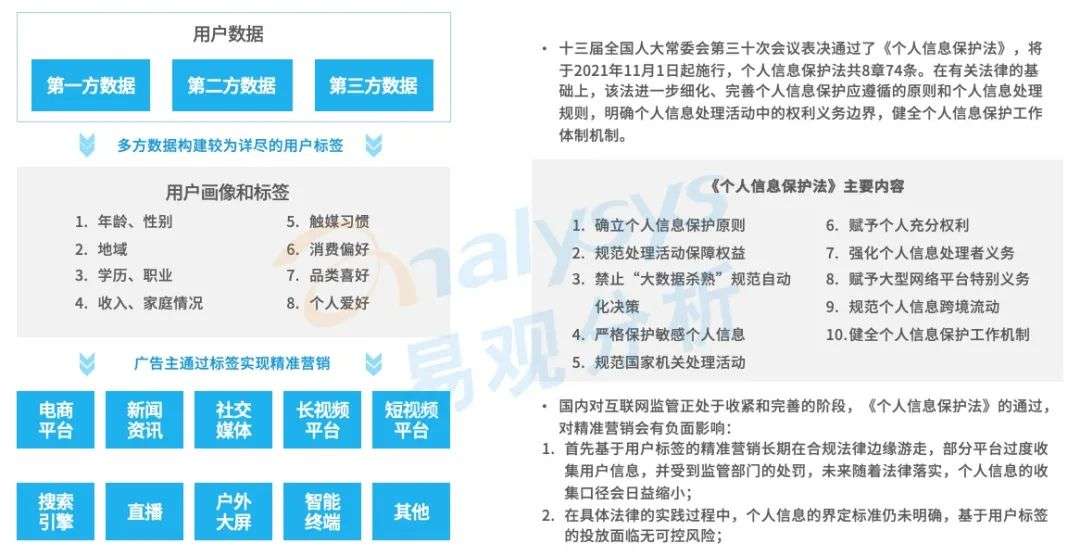 国内对互联网监管正处于收紧和完善的阶段,《个人信息保护法》的通过,对精准营销会有负面影响:首先基于用户标签的精准营销长期在合规边缘游走,部分平台过度收集用户信息,并受到监管部门的处罚,未来随着法律落实,个人信息的收集口径会日益缩小;其次,在具体法律的实践过程中,个人信息的界定标准仍未明确,基于用户标签的投放面临无可控风险。