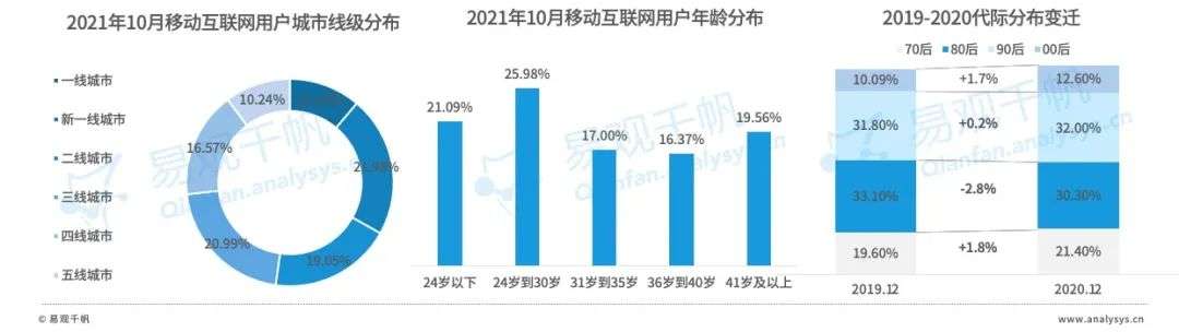 结合城市线级、年龄和消费水平分布, Z世代互联网原住民、小镇青年、银发人群在移动互联网用户中的占比可观,构成重点用户。代际变迁和消费分级为行业带来更多新蓝海,圈层经济、小镇经济、银发经济崛起,消费者愈发重视内容、体验及场景,营销环境及广告主诉求随之变迁。