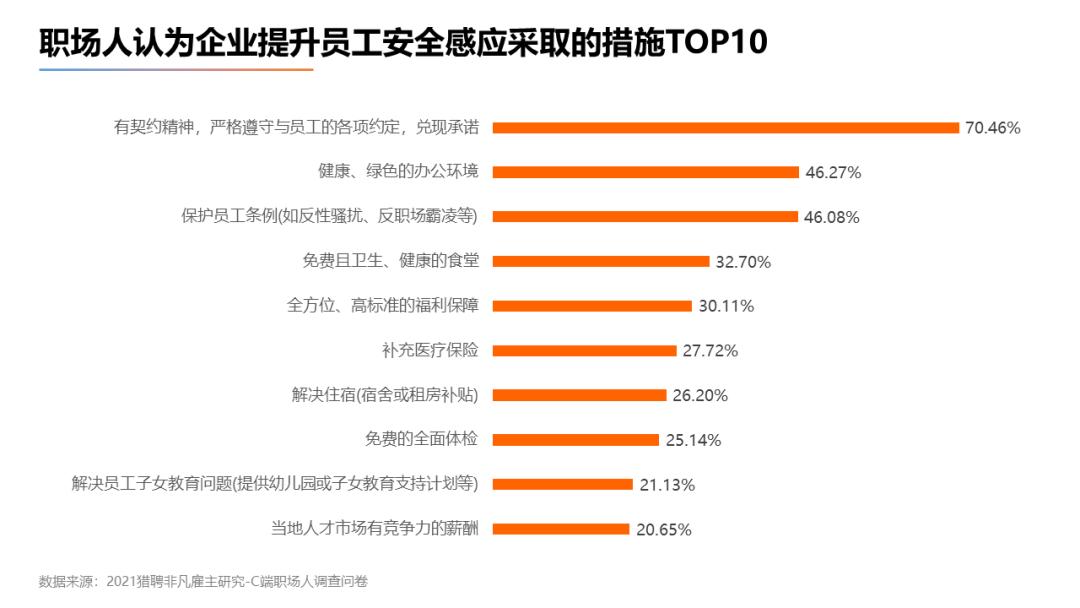 职场人安全感的基石是薪资福利这些与钱有关的因素,但职场人需要的安全感不止是钱能满足的。《未来职场“六感”研究白皮书》显示,职场人最看重的企业提升安全感的举措首先是契约精神;其次是“健康、绿色的办公环境”和“保护员工条例(如反性骚扰、反职场霸凌等)”。