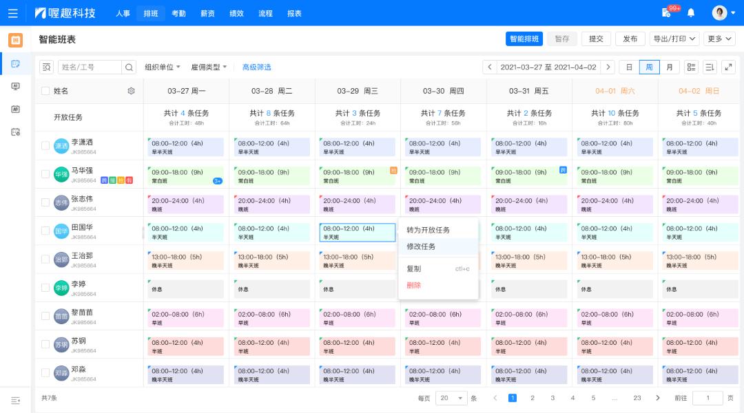 基于喔趣科技强大的智能算法能力与AI技术,产品提供了从业务预测、工时预估到劳动力分配的全流程管理,在提供多种排班模板与排班规则的基础上,满足企业人力快速调度的业务场景,达成人员安排需求与经营需求全拟合。
