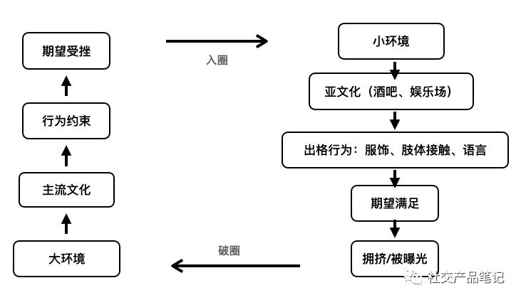 用户在大众环境下是有对自己设定期望。由于在大环境中的期望很难达成,用户必定受挫。所以小环境是会给用户一种的模糊预期,这会导致用户有主动尝试出格行为。如果这种行为是可以接受的同时,用户还获得了行为上的奖励反馈,用户则会高频行为出格,形成行为固化。当用户逐渐聚集起来,形成一定的小规模,营造了一种非常自然的特殊氛围,亚文化就有很大的概率产生。