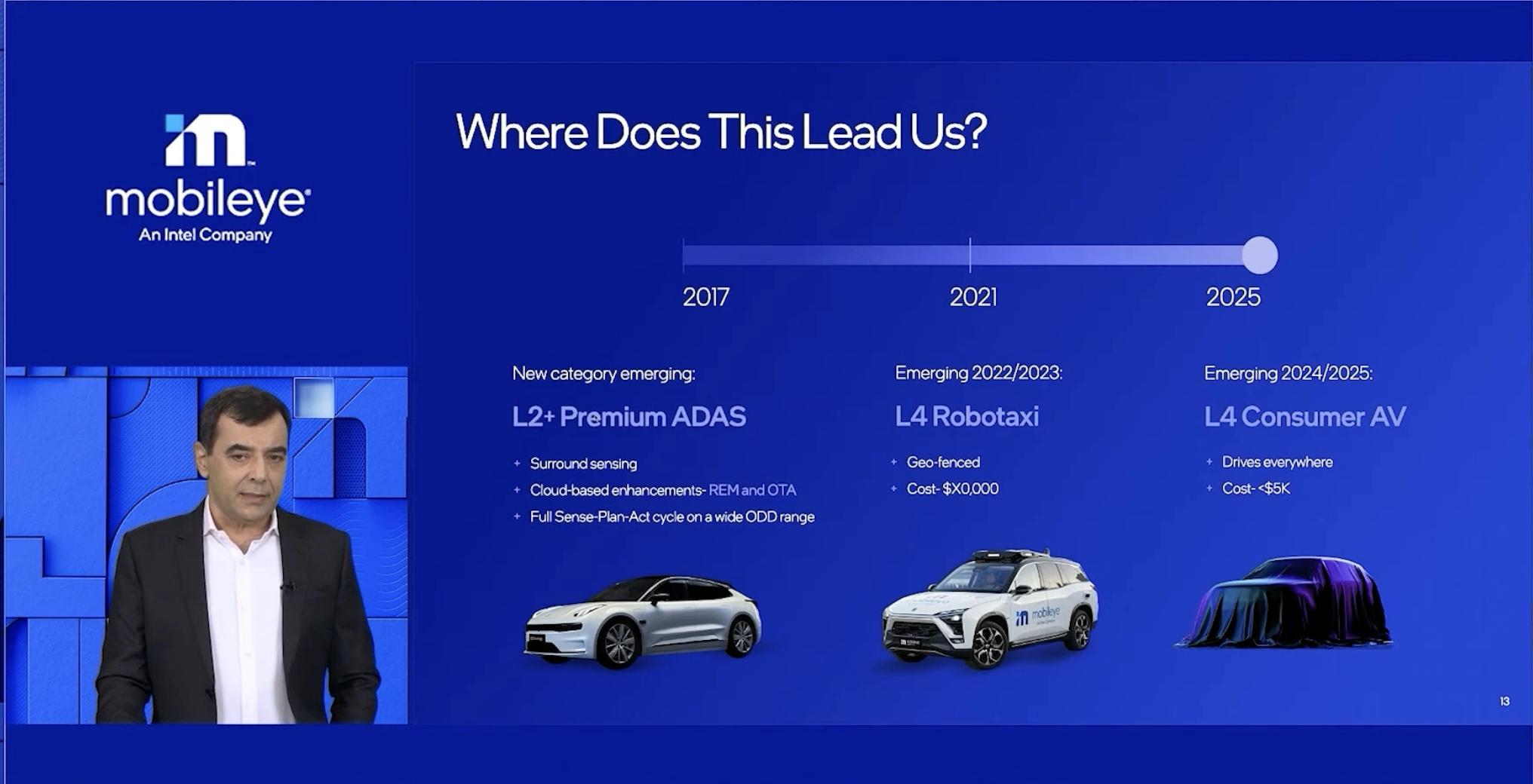 Amnon Shashua在大会演讲中表示:未来自动驾驶应用会有两个方向,Robotaxi(自动驾驶出租车)和消费级自动驾驶车辆。前者可以用于载人载货,但价格昂贵且只能在限定区域行驶,而后者则是价格便宜且行驶不受地域限制。