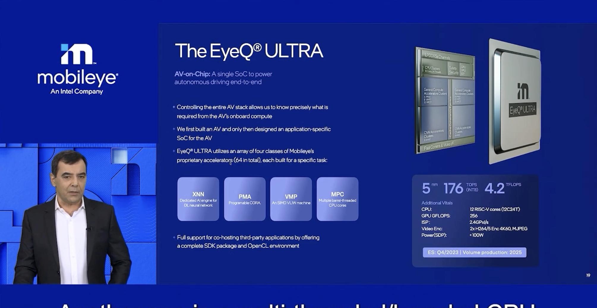 不过,在Mobileye看来,算力不是芯片的唯一衡量指标。“176 TOPS听上去是一个很小的数字,大概只有竞争对手号称算力的五分之一。但是关键的不仅是算力,而是效率。”Mobileye总裁兼首席执行官Amnon Shashua在CES演讲中如此表示。
