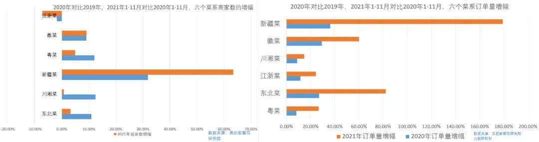 外卖商家方面也有着明显的“异动”。相较于2020年,2021年外卖商家增幅比较明显的是新疆菜,为63.3%,东北菜、川湘菜、粤菜、徽菜均保持个位数增长,江浙菜反而呈现负增长。反应到六个菜系里的订单量,增幅居于前三的是新疆菜、东北菜和徽菜,分别为179.09%、82.21%和60.22%。