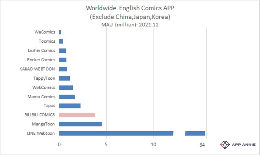 36氪出海获悉,据 APP Annie 数据,哔哩哔哩漫画海外版(Bilibili Comics)月活用户规模已超300万,在中日韩以外的英语市场中位列第三,日活峰值达到82.4万。