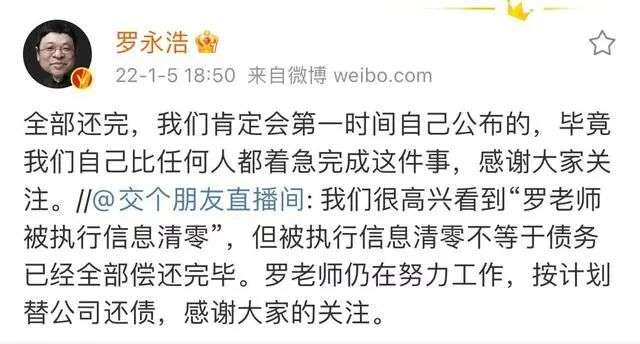 针对此事,交个朋友直播间回应称,“执行信息清零不等于债务已经全部偿还完毕,罗老师仍在努力工作,按计划替公司还债。”不过尽管罗老师还在努力打工还债,但既然不再被“限高”了,那估计离结清债务也不远了。