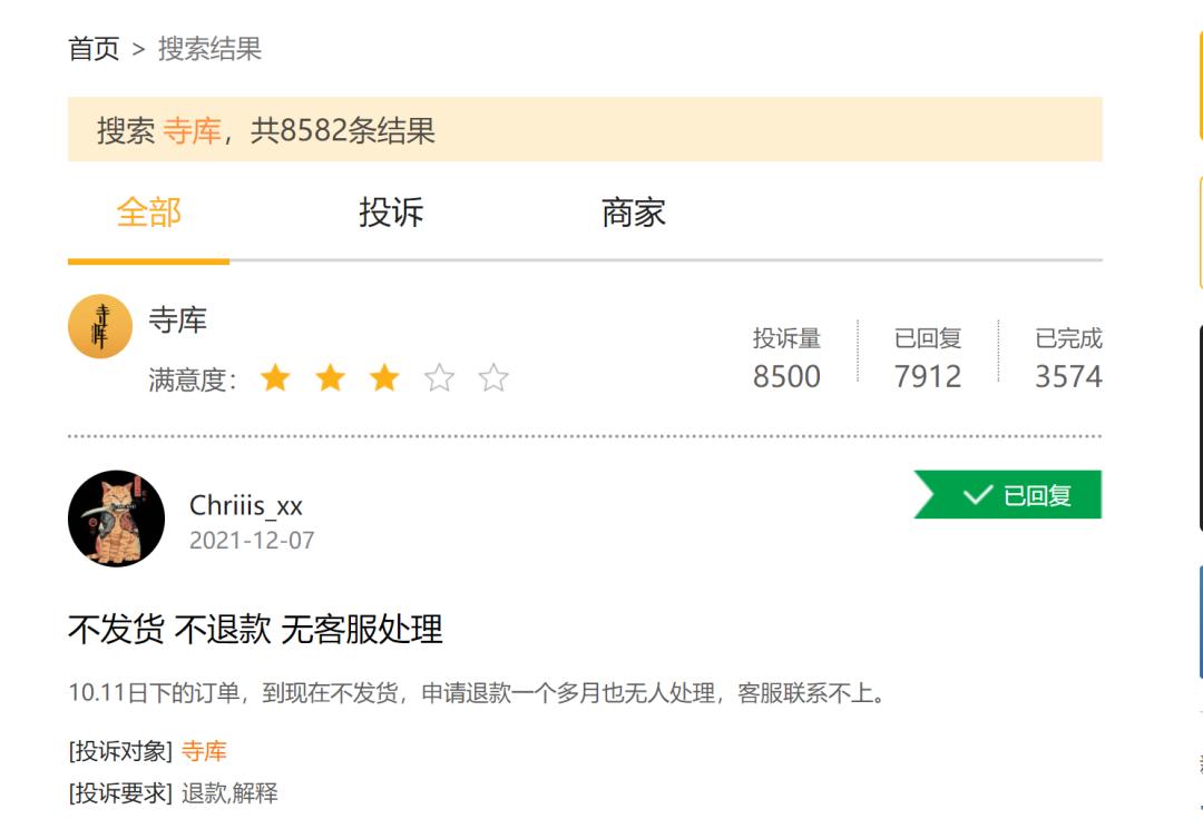 从供应商、员工到消费者,与寺库之间发生纠纷的新闻不时见诸报道。曾在寺库工作过的一位前员工表示,自己8月到10月的工资寺库一直没有发放;入驻寺库的一位商家表示,自己的30万货款一直没有被结算。另外,目前在黑猫投诉上寺库共有8500条相关投诉,其中官方已回复7912条,已完成的投诉仅为3574条,不到总投诉量的一半。