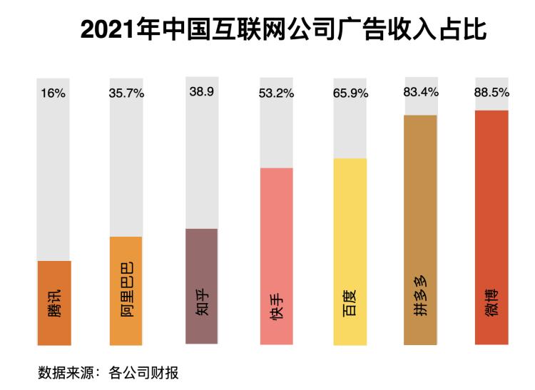 在中概股市值排名前10的互联网企业中,8家企业的广告年收入破百亿,头部几家大厂的广告收入占比均超过50%,其中百度这一数字为61.8%,微博高达88.5%。而近年来屡屡创下增长奇迹的字节跳动同样患有广告依赖症,据彭博社数据,该公司2020年实际收入约为2366亿元,其中广告收入占比为77%。
