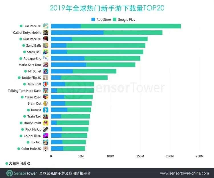 Sensor Tower数据显示,2019年上市的热门手游中,超休闲游戏下载量占比达到78%