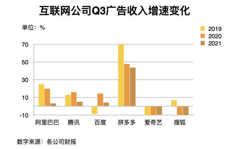 继本就增长放缓的2019年和2020年之后,BAT在内的互联网公司的广告收入增速,在2021年的第三季度集体下降到了个位数,其中阿里巴巴增长了3%,百度增长了6%,腾讯则降至了2017年以来的最低点5%。
