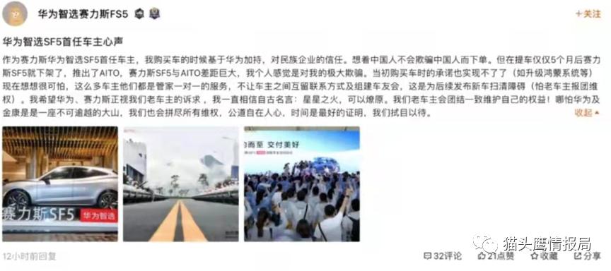 余承东的发布会结束后不久,赛力斯SF5的车主就开始了维权。