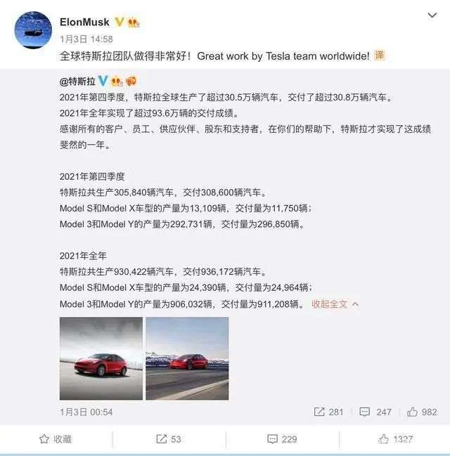 2022年刚过不久,各个车企就迫不及待公布了其2021年的年终成绩,特斯拉也不例外。作为全球新能源市场最大的鲶鱼,特斯拉在2021年表现优异,甚至出乎了机构的预期。数据显示,特斯拉在2021年第四季度生产30.584万辆汽车,交付30.86万辆汽车,亦即是说特斯拉在2021年的全年交付量达93.62万辆,离100万台大关仅有一步之遥,这个数据相比于2020年,增长了43.6万辆,增幅达87.2%,可以说在新能源市场里,特斯拉依然是一骑绝尘,遥遥领先于其他对手。受此影响,特斯拉的股价在1月3日一路狂飙,单日暴涨超13%。