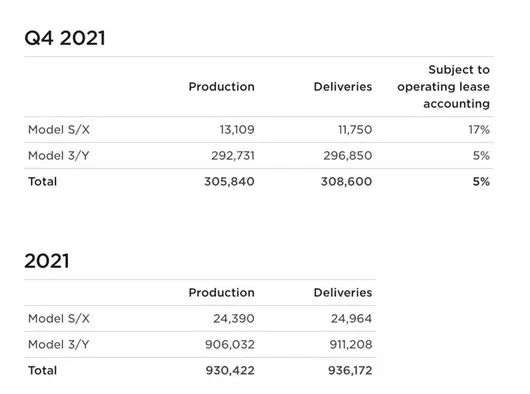 总结:对于特斯拉来说,在疫情、芯片短缺、负面舆论以及涨价的挑战中取得近百万的产销量确实值得骄傲,不过这已成过去,摆在特斯拉面前的是如何在接下来的一年里完成2022年的目标。鉴于马斯克在2021年股东大会上的豪言壮语,在疫情、芯片短缺仍将持续的状态下,特斯拉在2022年将会面临更大的困难。