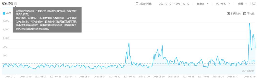 互联网大厂的人员变动让裁员话题一时间甚嚣尘上,裁员恐慌仿佛是笼罩在2021年底的“幽灵”。根据百度指数统计,“裁员”关键词在十二月的搜索峰值已达到2021年全年平均搜索指数的近5倍。
