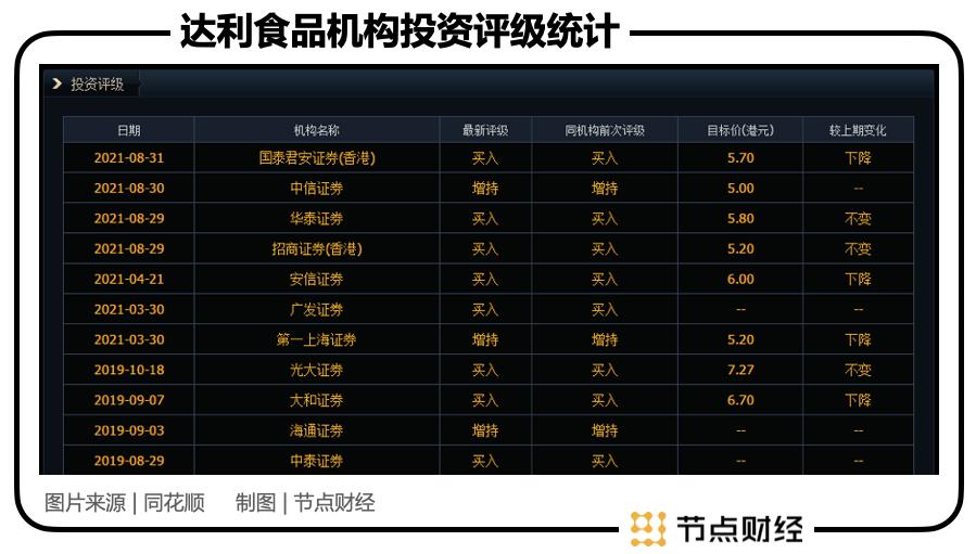 也许正是因为对达利食品转型的担心,国内机构对公司的积极性似乎不高,半年多来给出评级的机构不多,而反应在估值上,达利食品十倍出头的市盈率,也只处于行业的中下游水平。