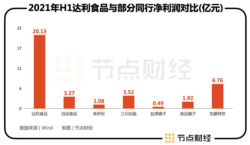 但是,对于2021年半年报净利润达到20.13亿元的食品饮料大厂来说,这样的估值水平又显得有些“拧巴”。同期洽洽食品、三只松鼠、盐津铺子、良品铺子、来伊份、东鹏特饮等A股知名同行绑到一块,还不如达利食品一家赚得钱多。