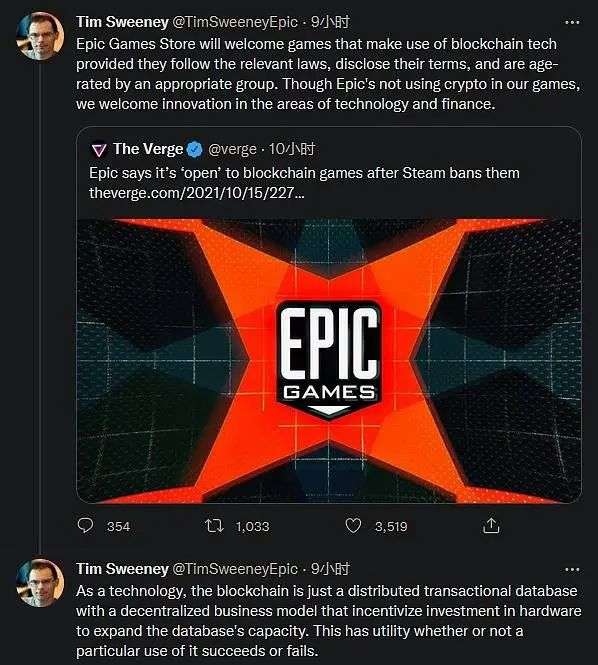 而V社死对头拳头社,则大张怀抱,表示Epic欢迎NFT游戏。Epic Games首席执行官Tim Sweeney表示,只要开发者遵守相关法律,并公开其条款,Epic Games Store将支持使用区块链技术的游戏,只不过这些游戏需要由一个合适的小组根据年龄进行分级。