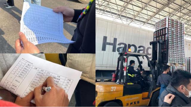 虽然没有10月底第一批空运和12月中旬第一批海运车厘子到达时人山人海的盛况,但相比其他水果区域,进口水果区的现场人头攒动,全国各地的采购商汇聚于此,操着新疆口音和“广普”的商人聊得不亦乐乎。每个货柜前都有几个负责人拿着货单,等待采购商下单,在纸上做好标记后,再叫叉车来将一板板的车厘子运走。