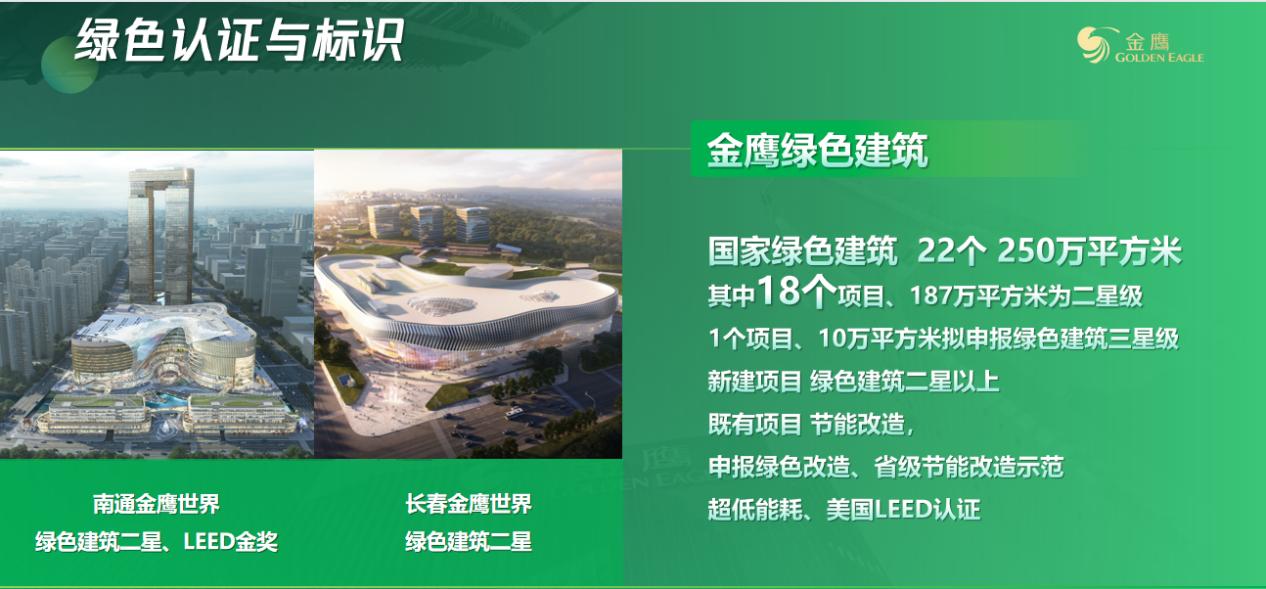 金鹰在绿色商场建设方面也积极投入,截止目前金鹰共拥有8座国家级绿色商场、4座省级绿色商场,其中南京金鹰世界以100%得分率获得国家级“绿色商场”荣誉称号,未来,金鹰将实现旗下绿色商场全覆盖。此外,金鹰所有项目都将按绿色二星以上标准建设,目前已获得22个绿色建筑国家级认证,累计认证面积达250万平方米。