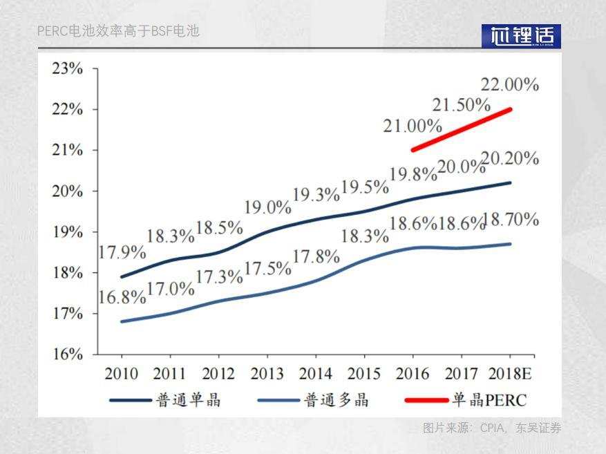 光伏行业的核心是“降本+升效”、降低度电成本。PERC电池诞生伊始,其转化效率就明显高于BSF电池,并且效率提升的速率更快, 因此PERC电池迅速替代BSF电池成为光伏行业的主流技术。