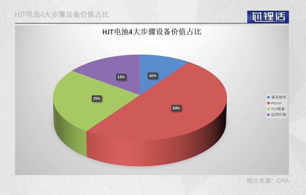 在HJT电池4大工艺步骤中,非晶硅薄膜沉积(PECVD)是最为关键的步骤,设备投资占比达总设备投入的50%,制绒清洗、TCO 制备、电极制备分别占总成本的10%、25%和15%。