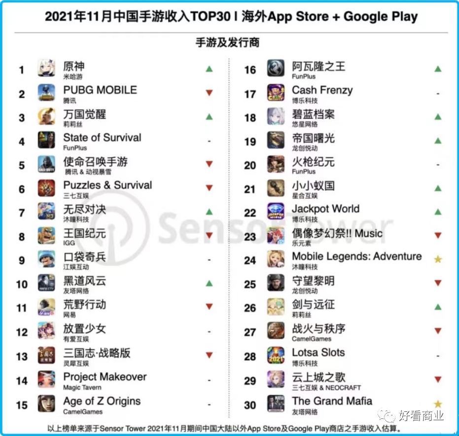 Sensor Tower 发布的2021年11月出海手游收入榜上,字节跳动旗下游戏出海收入 Top30的产品有3款。
