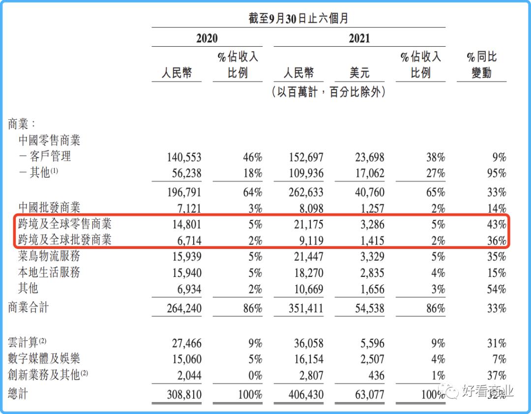 阿里2022财年上半年财报显示,其来自跨境及全球零售&批发业务的营收为302.94亿元,仅占当期总营收的7%。