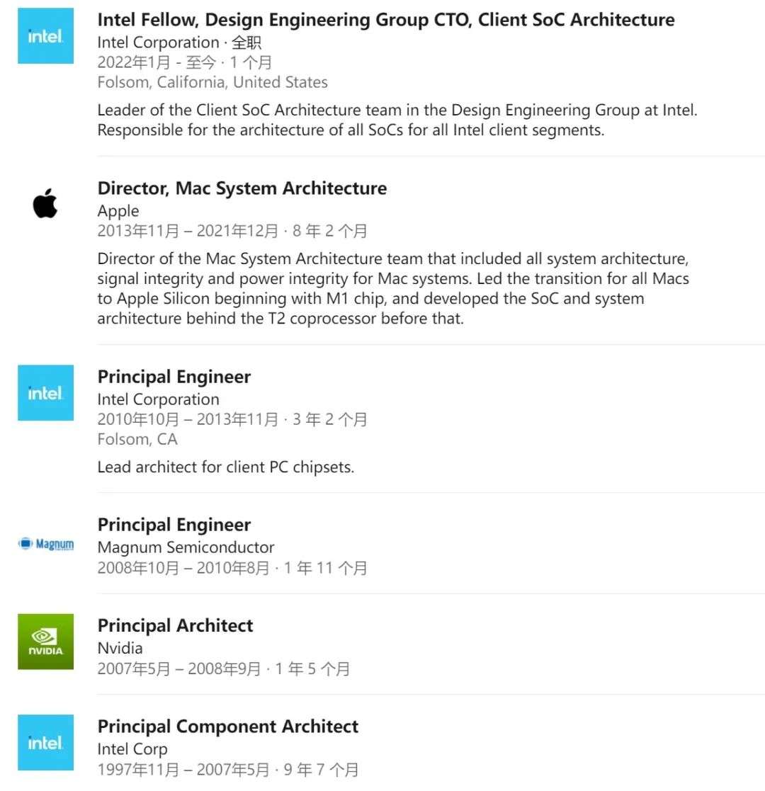 不过,与其说 Wilcox 是被英特尔“挖角”,莫如说是再续前缘。在 2013 年加盟苹果之前,他就已经是英特尔“老兵”了。Wilcox 曾效力于英特尔、英伟达以及马格南半导体,他在英特尔有过两次任职经历,总效力时间近 13 年。2010 至 2013 年期间,他是英特尔的首席工程师,负责英特尔凌动(Atom)的架构。