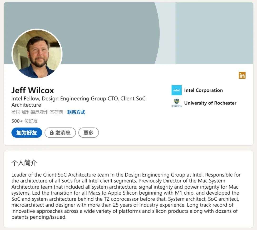 Wilcox 何许人也?他曾是苹果 Mac 系统架构总监,已经为苹果效力了八年。这期间,他主管 Mac 系统的整个系统架构、信号完整性(SI,signal integrity)和电源完整性(PI,power integrity)。他领导开发了 T2 协处理器 SoC 和系统架构,而在 Mac 由英特尔转向 M 系列自研芯片的道路上,Wilcox 功不可没。