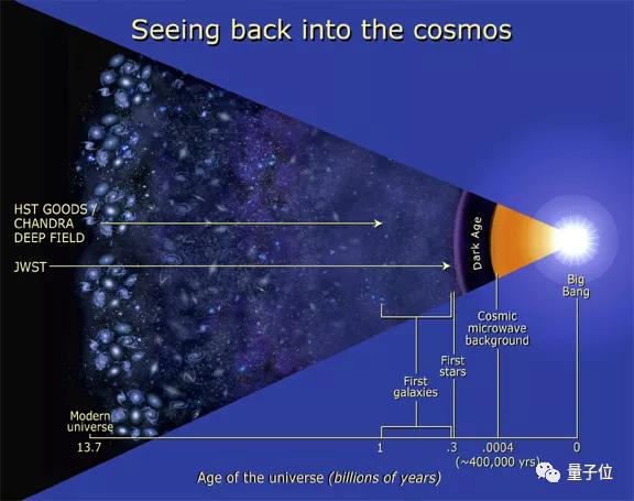 而韦伯望远镜又是主要观测红外线波长的设备,因此也就能“回溯”到更早的时间。