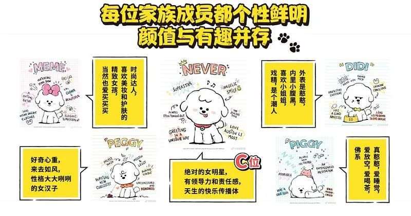 近年,Never后代繁衍旺盛,家族也在不断扩大。 当前,由流量担当Never奈娃,颜值担当和智慧担当MEME妹妹,长腿担当PEGGY佩奇,荷尔蒙担当DIDI弟弟以及呆萌担当PIGGY小猪猪这5名成员组成奈娃家族。 而它们之间的关系也是大家兴趣点所在。