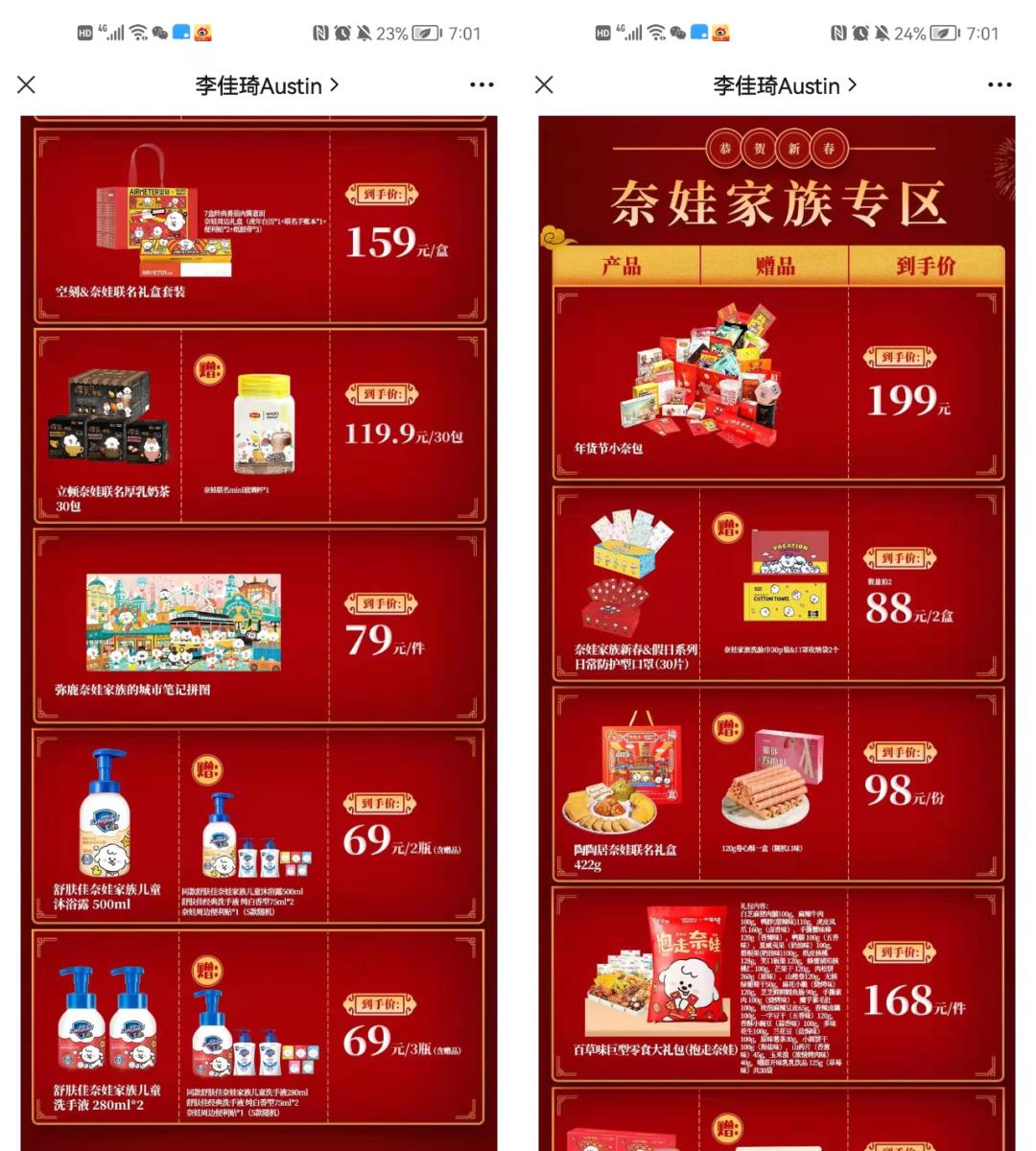 另一方面,还与多个品牌进行联名。以此次年货节专场为例,推出了九阳奈娃家族联名净水器家用水龙头、陶陶居奈娃联名礼盒、百草味巨型零食大礼包、空刻&奈娃联名礼盒套装、立顿奈娃联名厚乳奶茶、弥鹿奈娃家族的城市笔记拼图、舒肤佳奈娃家族儿童沐浴露\洗手液等多个联名产品,在强强联合间,不仅增加品牌标识度、加速融入年轻人的趋势,还通过李佳琦直播间的推广触达更多的消费者。