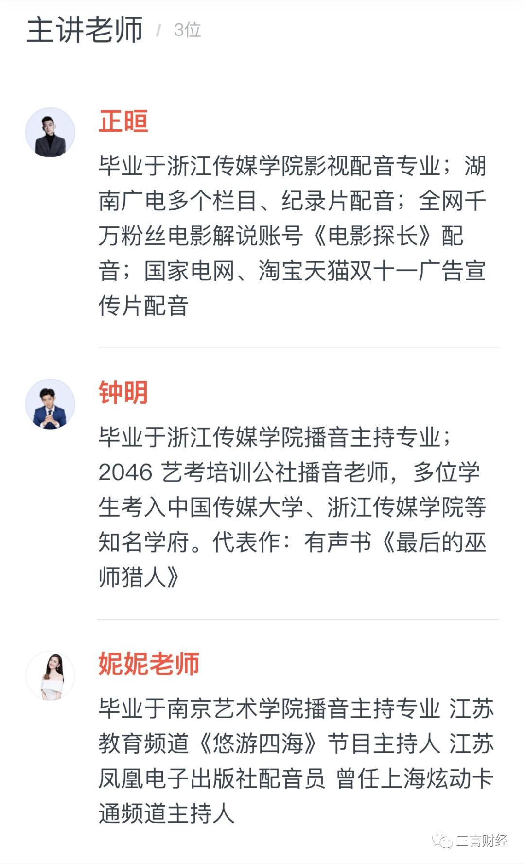 主讲老师均是科班出身,有两位毕业于浙江传媒学院播音主持专业,一位毕业于南京艺术学院播音主持专业。