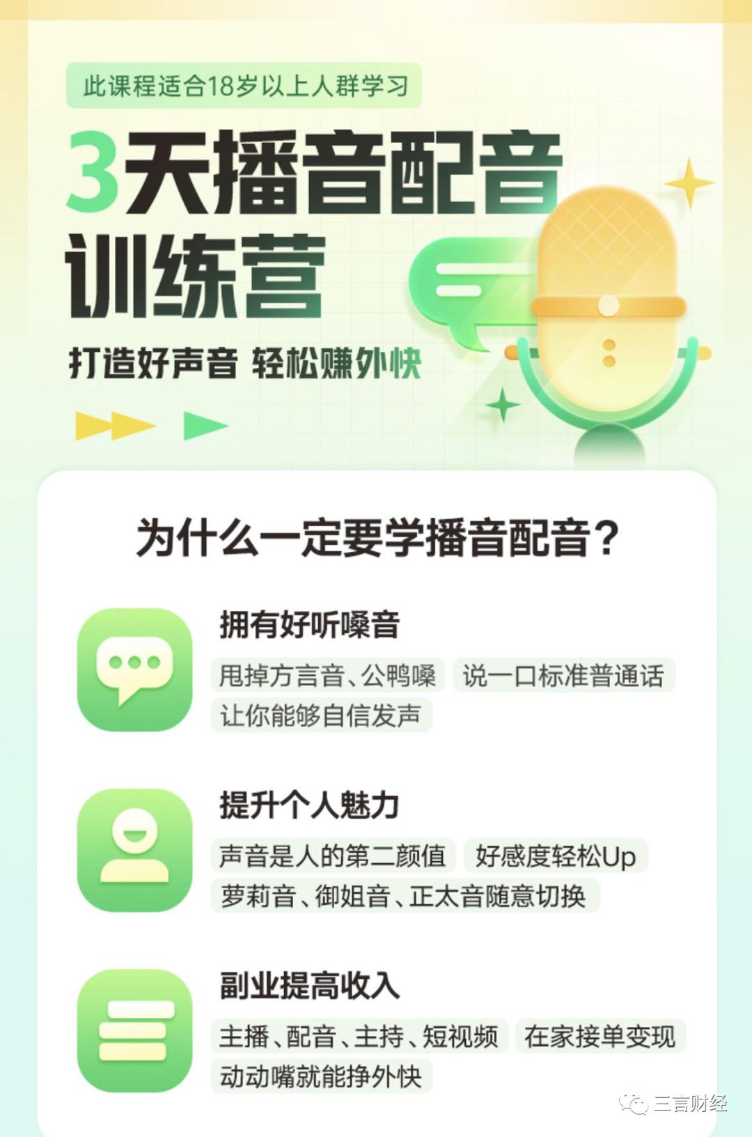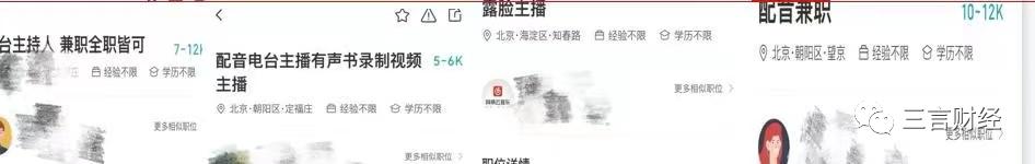以前,三言财经曾对泛滥的播音配音兼职广告进行过研究,当时这些播音配音兼职广告主要出现在公众号文章底部和音频平台中。